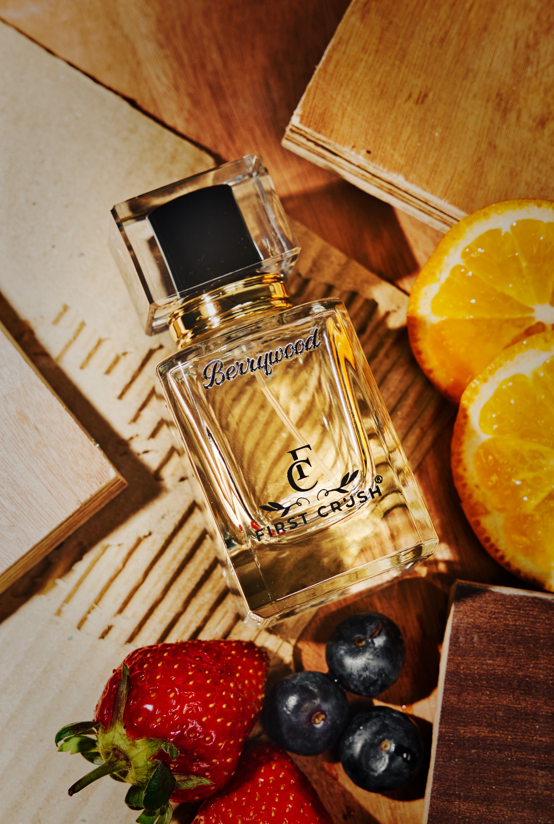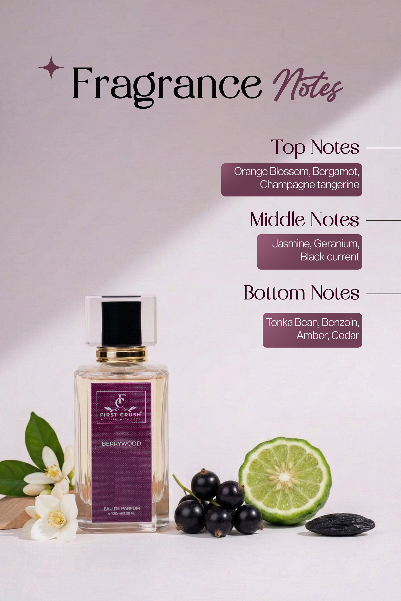 Berrywood opens with a radiant blend of citrus and champagne—effervescent, sparkling, and reminiscent of that first unexpected rush of excitement. Soft floral notes of jasmine and geranium unfold at the heart, mingling with the fresh sweetness of blackcurrant, capturing the delicate charm and innocent thrill of early attraction.
