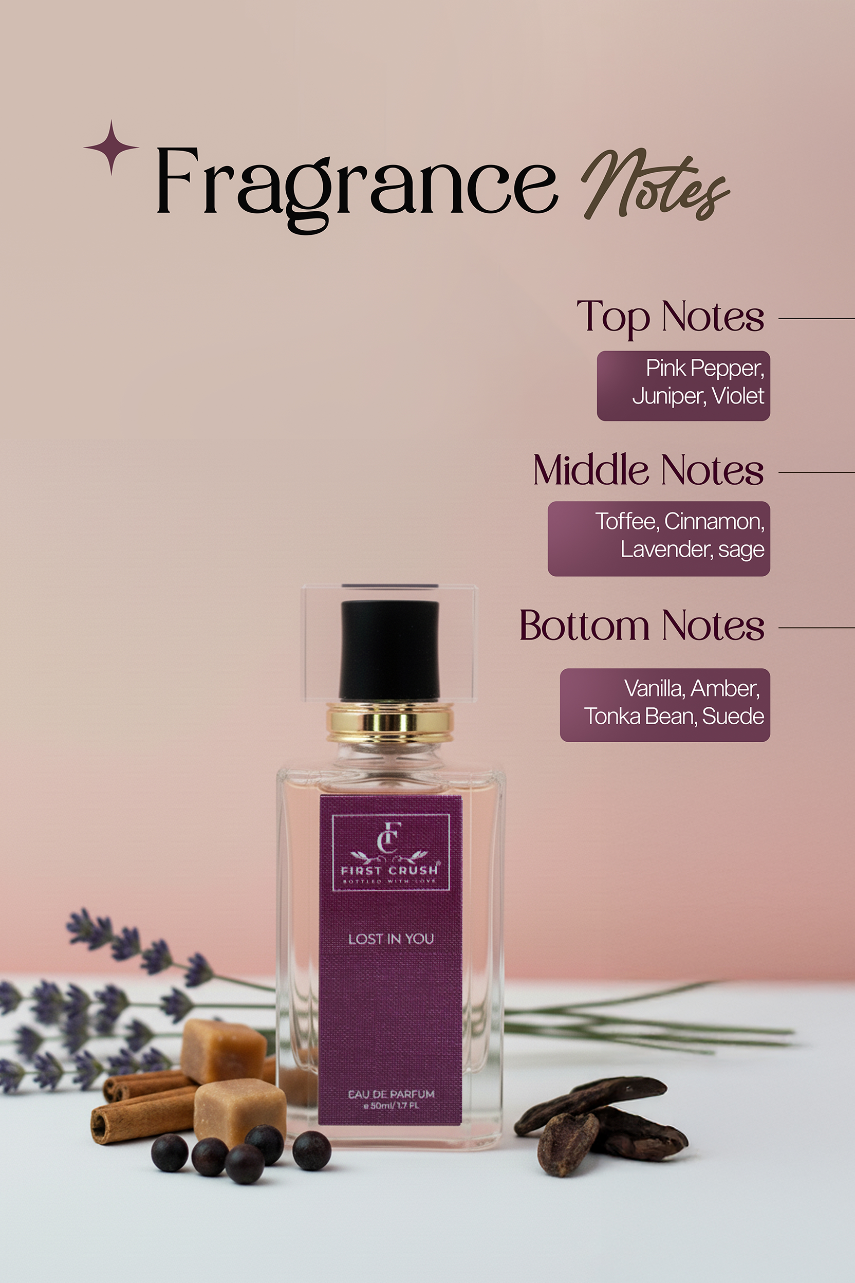Pink pepper, vanilla, toffee, and amber melt together into a sensual, comforting trail—bold yet tender, passionate yet refined. It lingers close to the skin and even closer to the heart, leaving behind a whisper of quiet confidence and deep allure.