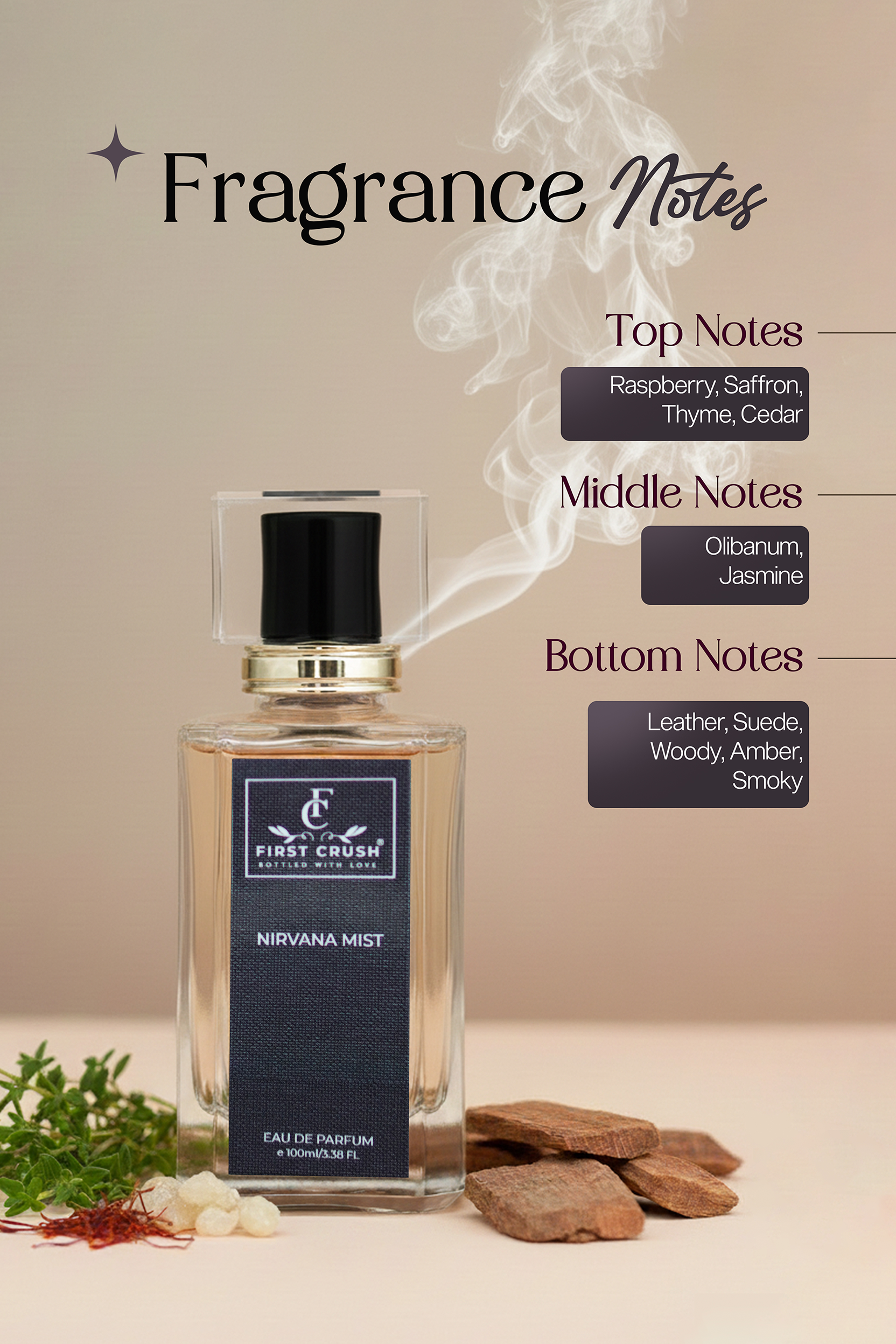 Nirvana Mist opens with dark raspberry, fiery saffron, wild thyme, and cedar—an intoxicating spark that mirrors the sudden, magnetic pull of a first crush. Its heart unfolds into resinous olibanum and shadowy jasmine, capturing the mysterious depth and quiet intensity of emotions that linger beneath the surface. The base of leather, suede, earthy woods, amber, and smoky undertones leaves a primal, magnetic trail—bold, haunting, and impossible to forget.