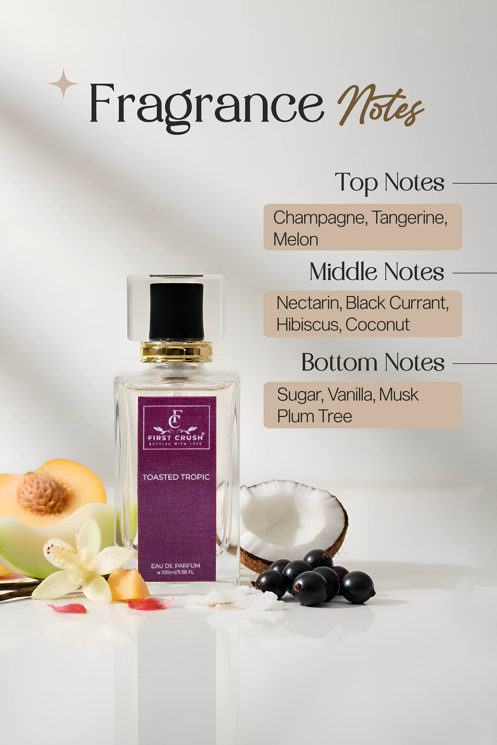 Toasted Tropic opens with a sparkling burst of champagne, tangerine, and melon, capturing the excitement and exhilaration of a first fluttering heart. The heart blooms with juicy nectarine, black currant, and exotic hibiscus, softened by creamy coconut, evoking playful smiles and lingering moments of delight.